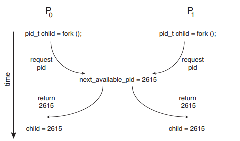 在这种情况下,两个进程 P0 和 P1 正在使用 fork() 系统调用创建子进程。回顾第 3.3.1 节,fork() 将新创建进程的进程标识符(PID)返回给父进程。在这个例子中,变量 next_available_pid 存在竞态条件,该变量表示下一个可用进程标识符的值。除非提供互斥,否则相同的进程标识符编号可能会被分配给两个独立的进程。