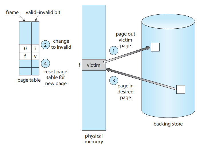 当没有空闲帧时,操作系统不能简单地终止进程(这是最差的选择)或换出整个进程(这太慢了)。它会执行页面置换。