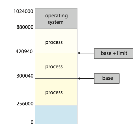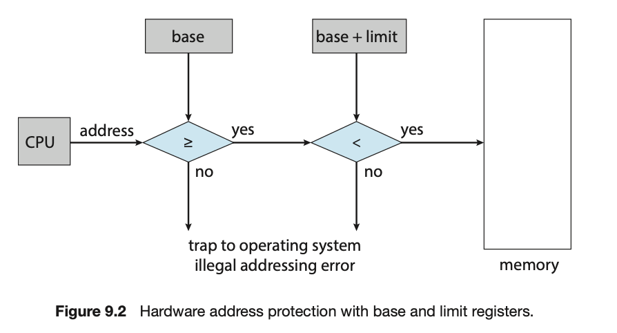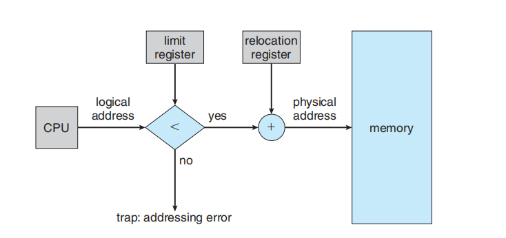 当 CPU 调度程序选择一个进程来执行时,分派器(dispatcher)会作为上下文切换的一部分,将正确的重定位寄存器和界限寄存器的值加载进去。因为 CPU 生成的每个地址都会对照这些寄存器进行检查,所以我们既可以保护操作系统,也可以保护其他用户的程序和数据,使其免受这个正在运行的进程的修改。