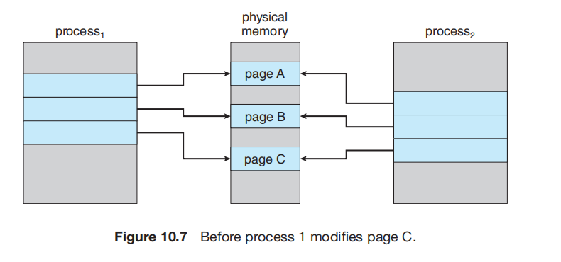例如,假设子进程试图修改一个包含部分栈 (stack) 内容的页面,而这些页面被设置为写时复制。操作系统将从空闲帧列表中获取一个帧,并创建一个这个页面的副本,将其映射到子进程的地址空间。子进程随后将修改其复制的页面,而不是修改属于父进程的那个页面。