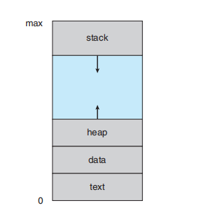 进程在内存地址空间中的布局。从低地址(0)到高地址(max)依次是:文本段(text),数据段(data),堆(heap)(向上增长),栈(stack)(向下增长)。