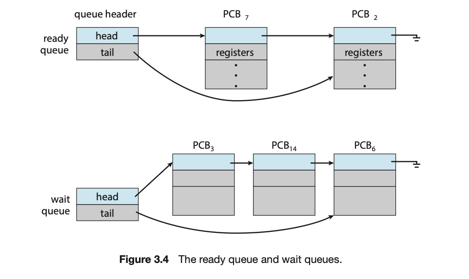当进程进入系统时,它们被放入一个 就绪队列(ready queue) 中。它们在这个队列中等待,直到被选中在一个CPU核心上执行。这个队列通常存储为一个链表。就绪队列的头部包含指向链表中第一个PCB的指针,每个PCB都包含一个指向就绪队列中下一个PCB的指针。