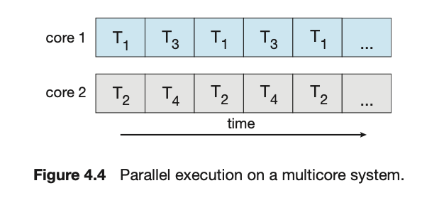 对于一个单CPU核心的系统,任何时候都不会有超过一个进程在运行。然而,在一个多核系统上,可以同时运行多个进程。如果进程比核心多,多余的进程将不得不等待,直到一个核心空闲出来并可以被重新调度。