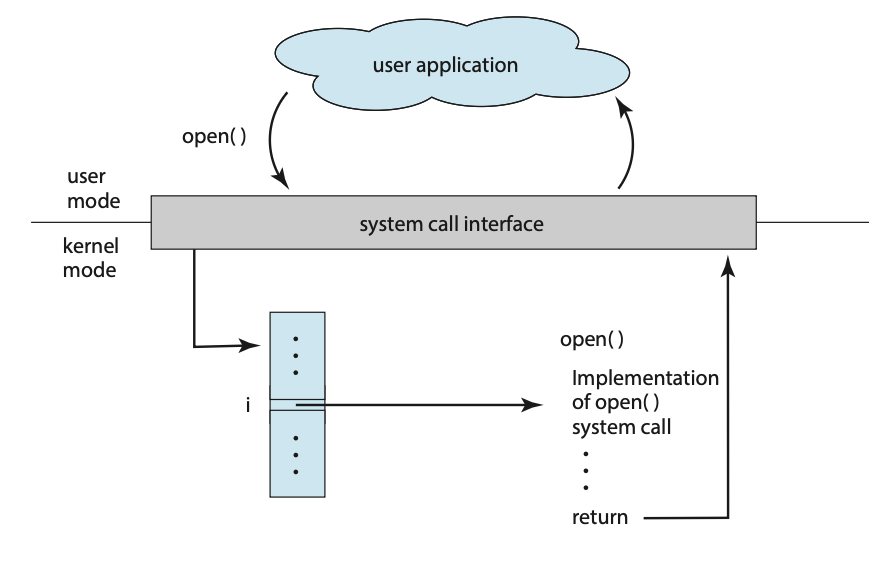 图中展示了一个用户应用程序从用户模式(user mode)通过系统调用接口调用open()函数。进入内核模式(kernel mode)后,接口通过一个索引 i 在系统调用表中查找并执行open()系统调用的具体实现,然后返回结果。