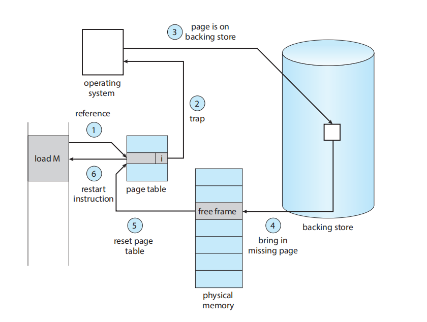 另一种策略是只在需要时才加载页面。这项技术被称为请求分页 (demand paging),在虚拟内存系统中被普遍使用。通过请求分页,页面只在程序执行期间被请求 (demanded) 时才被加载。那些从未被访问过的页面就永远不会被加载到物理内存中。