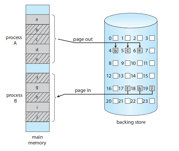 然而,包括 Linux 和 Windows 在内的大多数系统,现在使用标准交换的一种变体,即换出进程的部分页面 (pages)——而不是整个进程。这种策略仍然允许物理内存被超额订阅,但不会招致交换整个进程的昂贵代价。事实上,这个术语现在有点用词不当。页换出 (paging out) 指的是将一个页面从内存移动到后备存储。页换入 (paging in) 指的是从后备存储移动一个页面到内存。