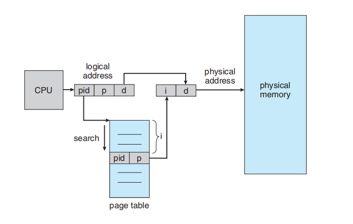 图片内容:CPU 生成逻辑地址,分为 pid (进程ID), p (页号), d (页偏移)。系统使用 pid 和 p 在“页表”(page table) 中进行“搜索”(search)。如果找到匹配的 [pid, p] 条目(位于索引 i),则 i 就是帧号。i 和偏移 d 组合成物理地址,指向“物理内存”(physical memory)。