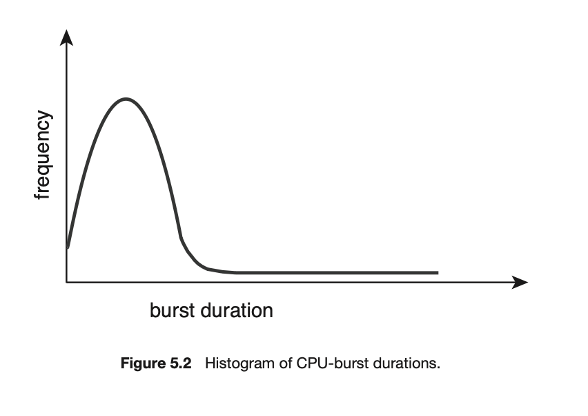 大多数进程可以被描述为I/O密集型或CPU密集型。一个I/O密集型进程(I/O-bound process)**是那种花在I/O上的时间比花在计算上的时间多的进程。