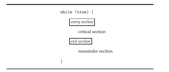 我们通过讨论所谓的临界区问题(critical-section problem)来开始对进程同步的思考。考虑一个由 n 个进程 {P0, P1, ..., Pn-1} 组成的系统。每个进程都有一段代码,称为临界区(critical section),在该区中进程可能正在访问——并更新——至少与一个其他进程共享的数据。系统的重要特征是,当一个进程在其临界区内执行时,没有其他进程被允许在其临界区内执行。也就是说,没有两个进程同时在它们的临界区内执行。临界区问题就是设计一种协议,进程可以使用该协议来同步它们的活动,从而协作地共享数据。每个进程必须请求许可才能进入其临界区。实现这一请求的代码部分是进入区(entry section)。临界区之后可能紧跟着一个退出区(exit section)。剩余的代码是剩余区(remainder section)。