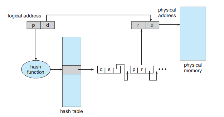 处理大于 32 位地址空间的一种方法是使用哈希页表 (hashed page table),其哈希值就是虚拟页号。哈希表中的每个条目都包含一个链表,链表中的元素都哈希到同一位置(用于处理冲突)。每个元素都包含三个字段:(1) 虚拟页号,(2) 映射的页帧的值,以及 (3) 指向链表中下一个元素的指针。