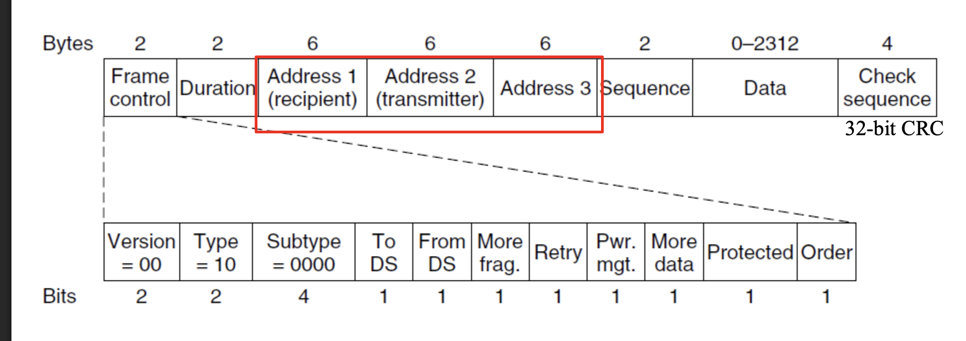 address 1 : 接收方 (recipient) 地址。 是无线媒介上的下一个接收者 ;