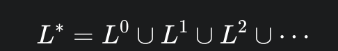 L*的含义: 表示由L中的字符串进行零次或多次任意拼接(concatenation)而形成的所有新字符串的集合