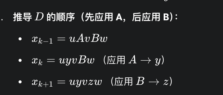 定理: 设 G 是一个上下文无关文法 (CFG)。那么存在一个特定的“泵长度” p, 对于 L(G)(G 生成的语言)中任何长度 |w| ≥ p 的字符串 w, w 必定可以被拆分成五个部分 w = uvxyz,并且必须满足以下两个条件、