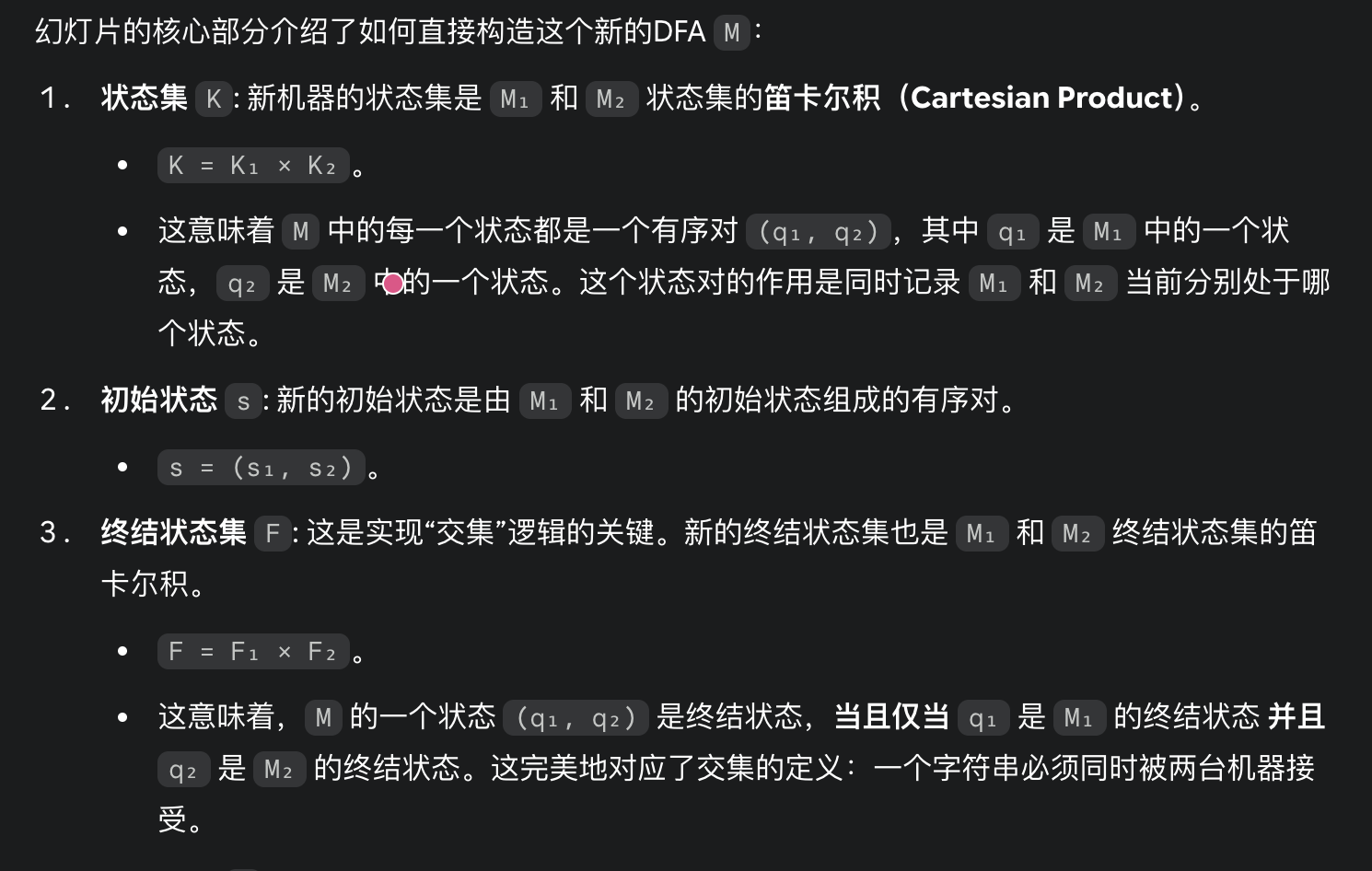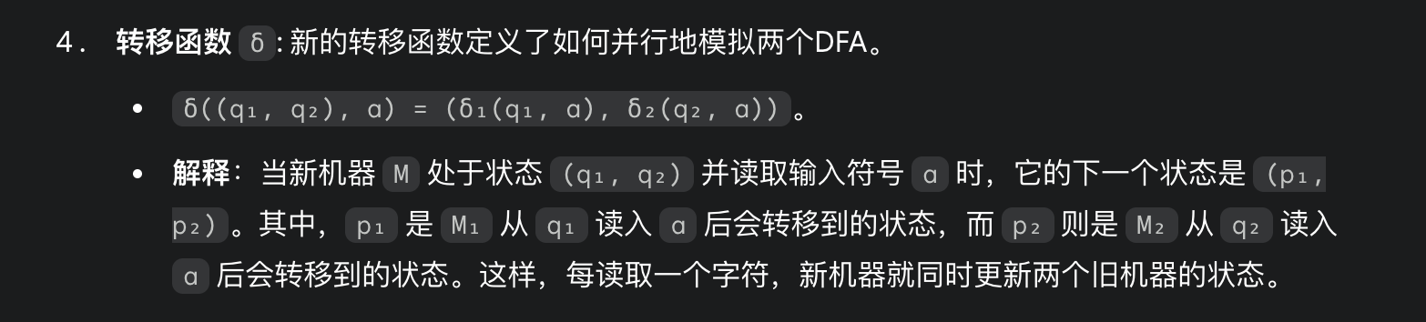 前提提示, 正则语言是在“交集”和“补集”下封闭的。对于交集, 我们通过并行模拟(parallel simulation)两个 DFA(确定性有限自动机)来构造一个新的 DFA;对于补集: 我们通过将一个 DFA 的“接受状态”和“非接受状态”互换来构造。