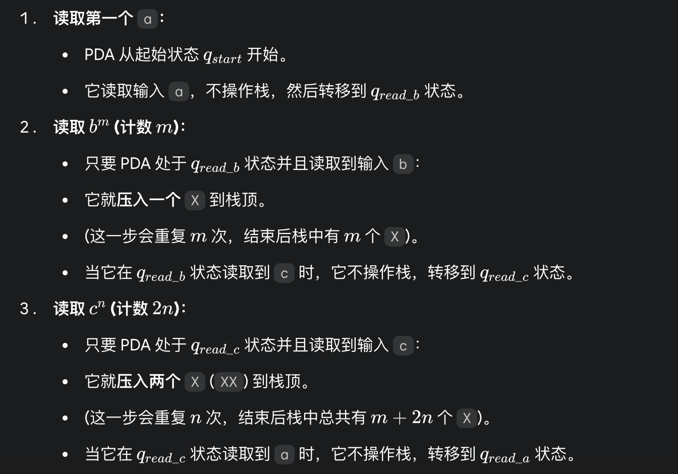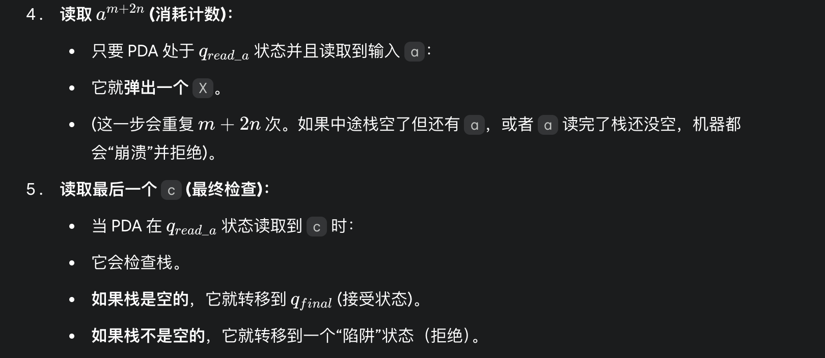 可以看到,F标记为 q 并不意味着状态到了 q 就可以结束,还需要栈为空;因此,构造PDA的时候不需要太考虑繁复的状态关系, 可以通过栈来帮助PDA的构造