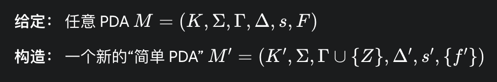 替换为一大组新规则,每种可能的栈符号 A ∈ Γ ∪ {Z} 都有一条 ((q, a, A), (p, γA)),先弹出 A 再压入 γA