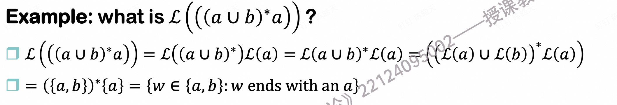 递归步骤 ℒ(αβ) = ℒ(α) ℒ(β). ℒ(α|β) = ℒ(α) ∪ ℒ(β). ℒ(α*) = (ℒ(α))*