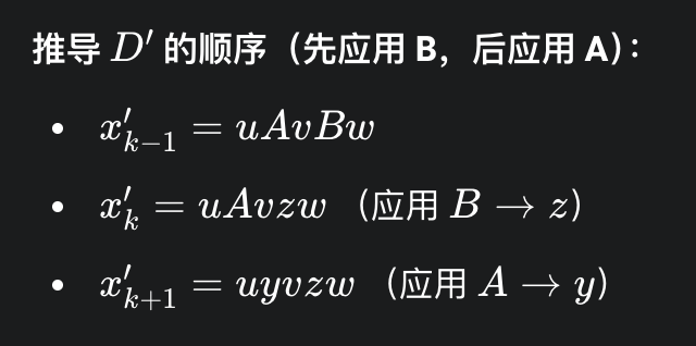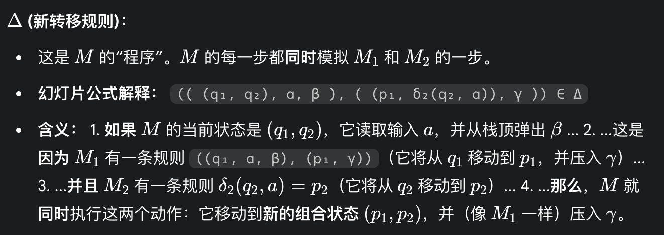这里的 CFG 中几乎只有 a 是和 PDA转移相关的, 彰显了PDA转化,后面的(r, C₁, p') (p', C₂, p) 就是探讨 怎么到 p (p由CFG左侧定义是什么)的,更是一种递归式的长推导,其中黄色标注出来的 p' 完全是 右侧 自定义的,因此可能有好几种组合 ;注意最左边 r 一定是 PDA的 r , C1 C2 分别 在 CFG规则等式右侧