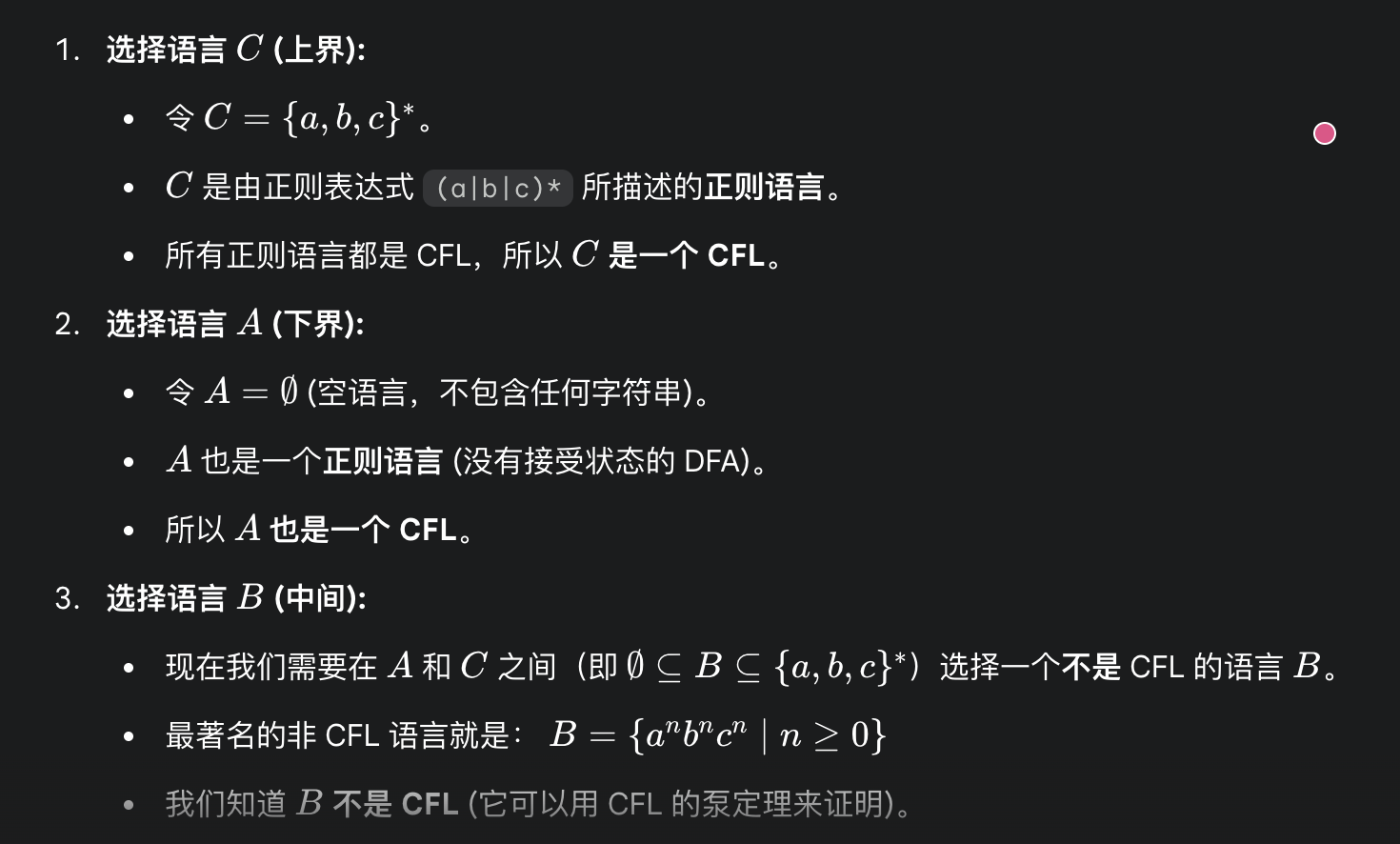 只需要创造 三个 CFL 的并集,即a b 数量不相等 的 𝒂𝒊𝒃𝒋𝒄𝒌 , b c 数量不相等的 ......